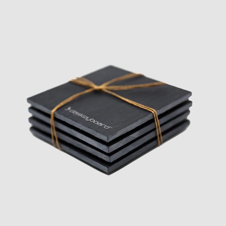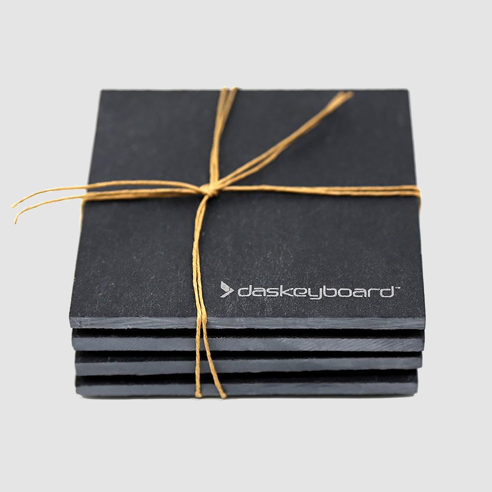 Protect your tabletops with this set of 4 heavy duty stone coasters. With rubber feet adorning the bottom of each coasters, they won't slide. The Das Keyboard logo is printed subtly on the bottom right of each coaster.