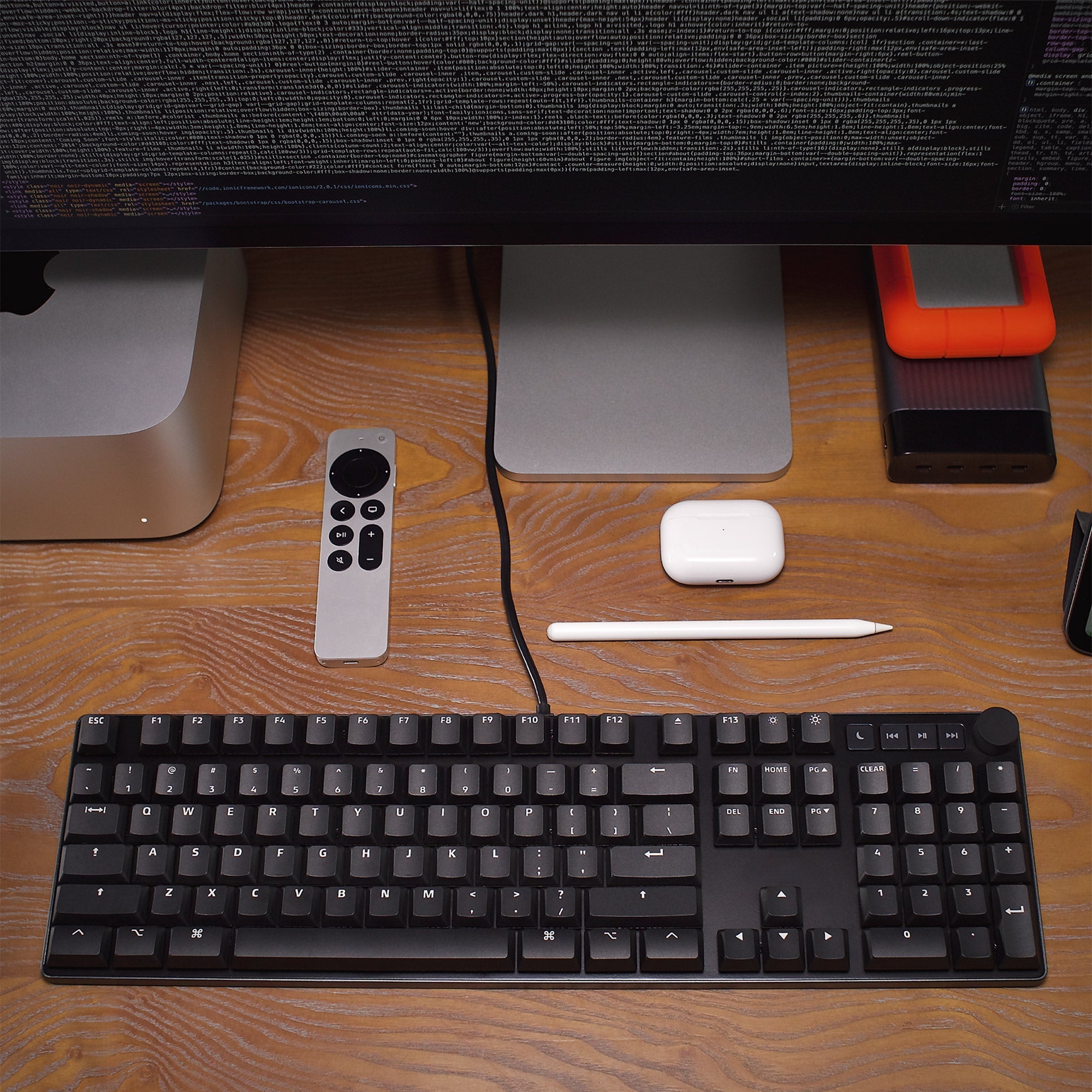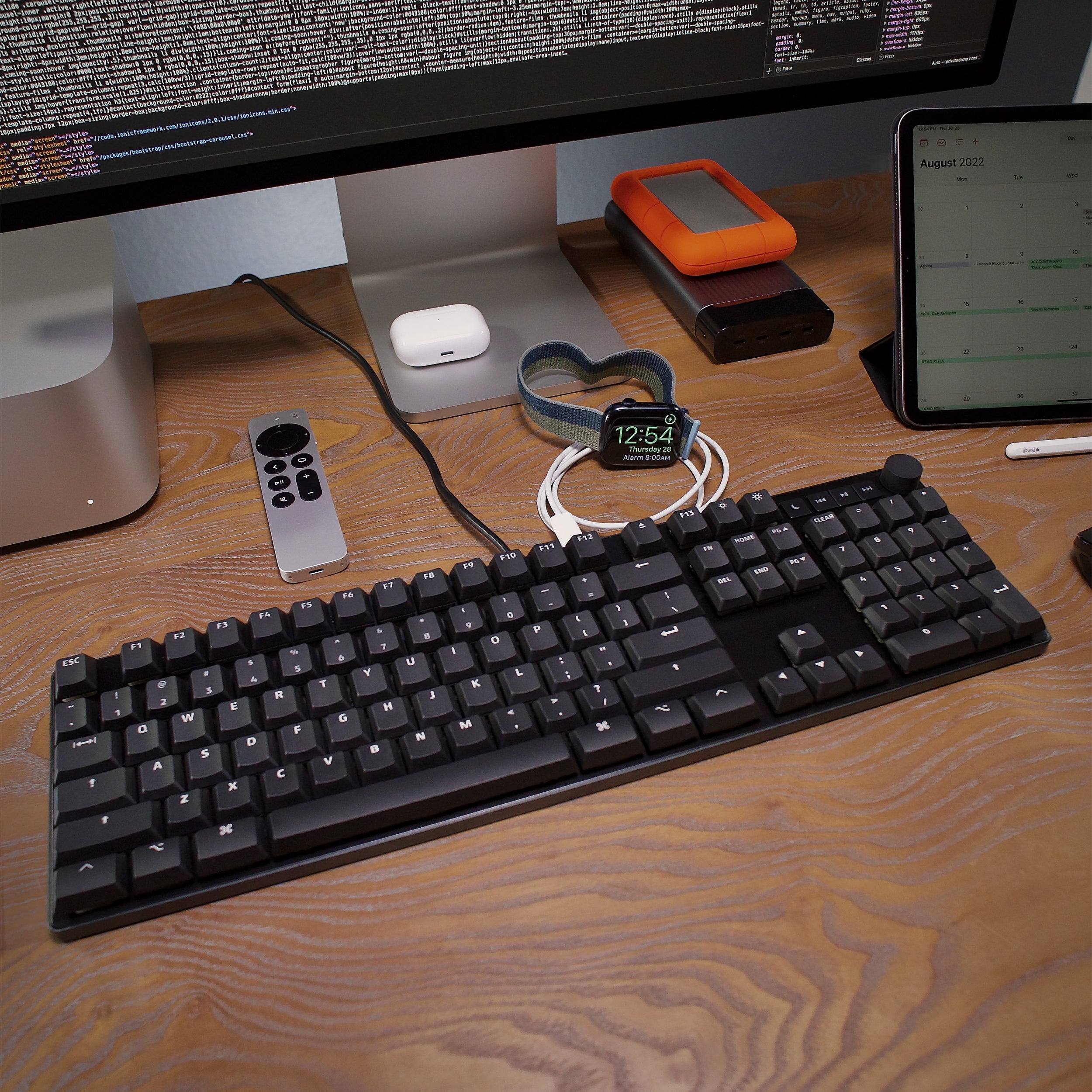 - Mac layout, USB-C hub, sleep key, and volume knob