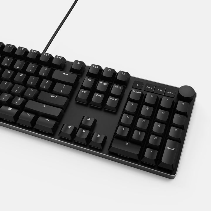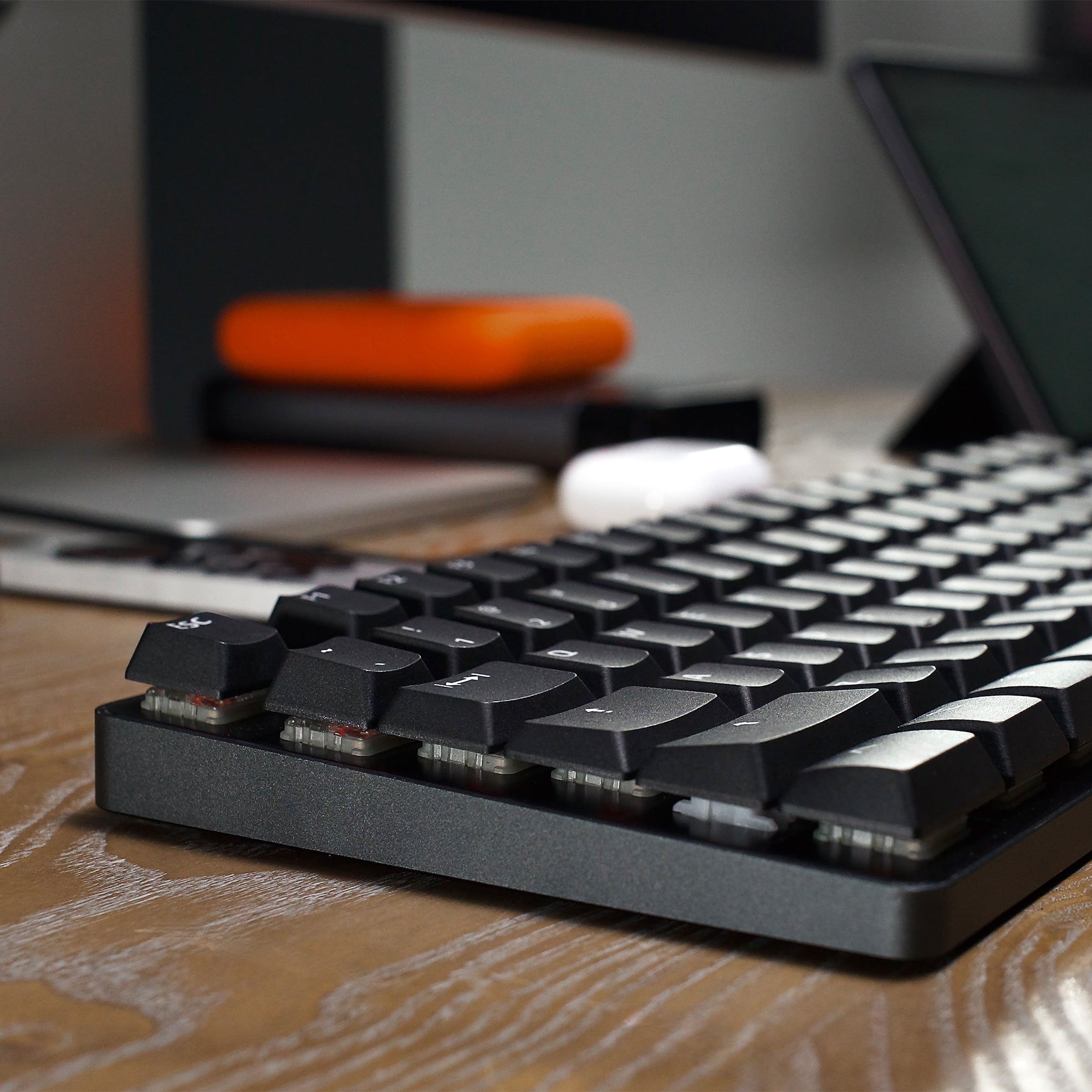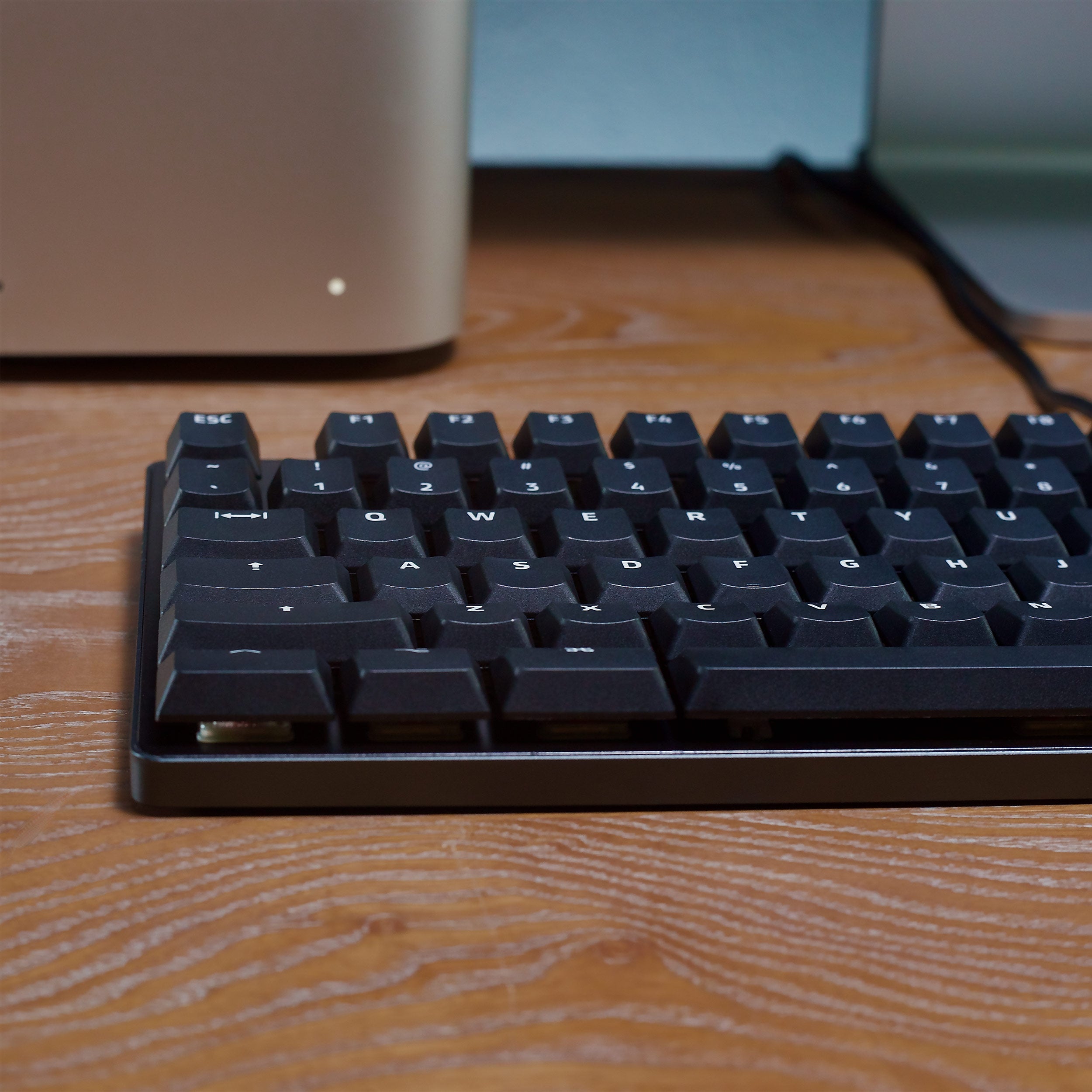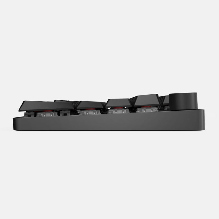 - Low-profile Cherry MX Red switches and PBT keycaps