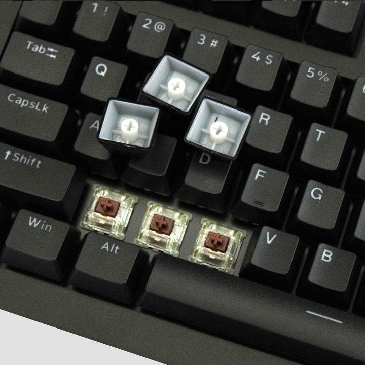 The Das Keyboard Touch double shot PBT keycap set fits Cherry MX and other MX keyboards and has a 104-key US layout with an OEM profile. These beautifully crafted keycaps are slightly textured for an added tactile experience and have a larger, uppercase, modern font.