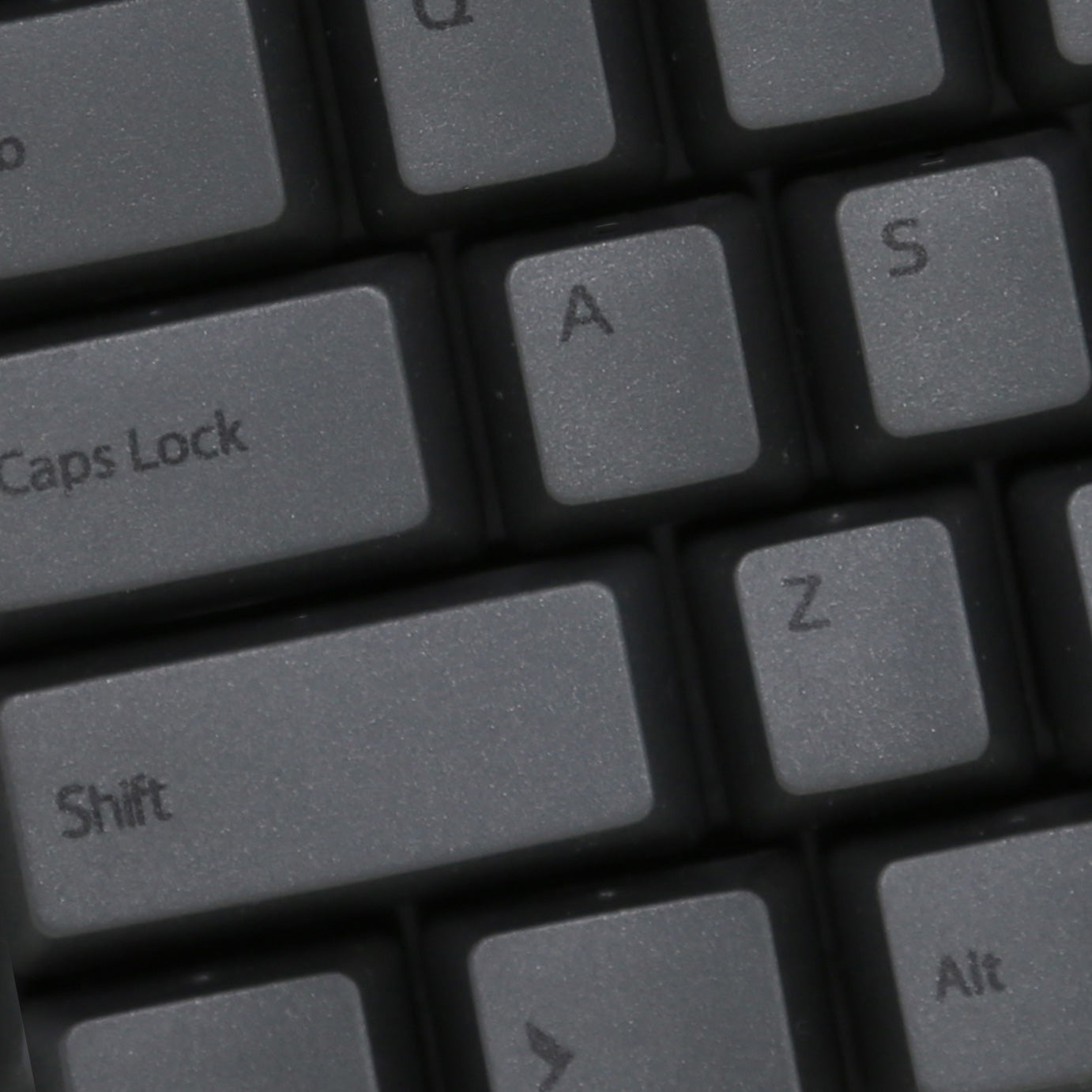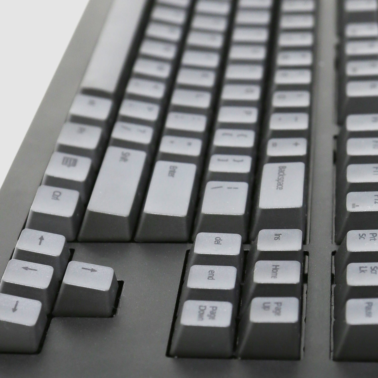 Black letters are printed on dark gray keys for a sophisticated design developed for more experienced touch typists. With a clean look and extremely soft and textured touch, the dark inscriptions are intended to blend seamlessly into the keycap, especially in low light.